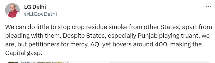 ਹੁਣ ਦਿੱਲੀ ਦੇ ਉਪ ਰਾਜਪਾਲ ਵੀਕੇ ਸਕਸੈਨਾ ਨੇ ਦਿੱਲੀ ਵਿੱਚ ਹਵਾ ਦੀ ਗੁਣਵੱਤਾ ਖ਼ਰਾਬ ਕਰਨ ਲਈ ਪੰਜਾਬ ਸਰਕਾਰ ਨੂੰ ਜ਼ਿੰਮੇਵਾਰ ਠਹਿਰਾਇਆ ਹੈ। ਉਨ੍ਹਾਂ ਕਿਹਾ ਕਿ ਅਸੀਂ ਉਨ੍ਹਾਂ ਨੂੰ ਪਰਾਲੀ ਦੇ ਧੂੰਏਂ ਨੂੰ ਰੋਕਣ ਦੀ ਅਪੀਲ ਹੀ ਕਰ ਸਕਦੇ ਹਾਂ, ਹੋਰ ਕੁਝ ਨਹੀਂ ਕਰ ਸਕਦੇ।