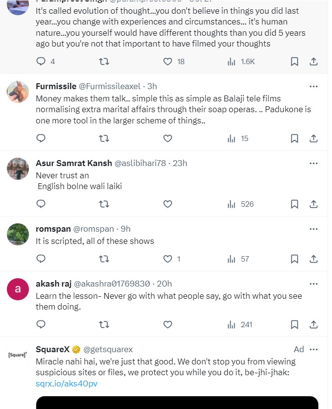 ਦੀਪਿਕਾ ਦਾ ਕੰਟ੍ਰੋਡਿਕਟਰੀ ਸਟੇਟਮੈਂਟ ਯੂਜ਼ਰਜ਼ ਨੂੰ ਪਸੰਦ ਨਹੀਂ ਆਇਆ। ਇਕ ਨੇ ਕੁਮੈਂਟ ਕੀਤਾ, ‘ਅੰਗਰੇਜ਼ੀ ਬੋਲਣ ਵਾਲੀ ਕੁੜੀ ‘ਤੇ ਭਰੋਸਾ ਨਹੀਂ ਕੀਤਾ ਜਾਣਾ ਚਾਹੀਦਾ।’ ਇਕ ਹੋਰ ਨੇ ਲਿਖਿਆ, ‘ਇਸ ਨੇ ਸਾਨੂੰ ਦੱਸਿਆ ਕਿ ਸੁੰਦਰ ਚਿਹਰੇ ਦਾ ਸੁੰਦਰ ਦਿਲ ਵੀ ਹੋ, ਇਹ ਜ਼ਰੂਰੀ ਨਹੀਂ।’
