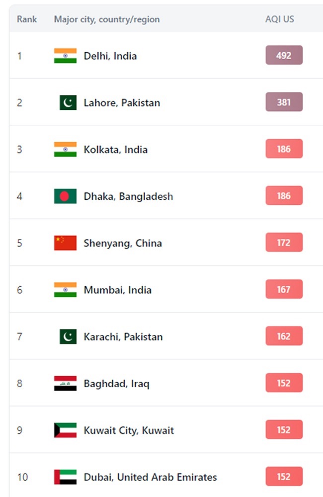 ਅੰਕੜਿਆਂ ਅਨੁਸਾਰ, ਕੋਲਕਾਤਾ ਦੇ ਨਾਲ ਦਿੱਲੀ (AQI-186) ਅਤੇ ਮੁੰਬਈ (AQI-167) ਦੁਨੀਆ ਦੇ ਸਭ ਤੋਂ ਵੱਧ ਪ੍ਰਦੂਸ਼ਿਤ ਸ਼ਹਿਰਾਂ ਵਿੱਚੋਂ ਇੱਕ ਹਨ। ਇਸ ਸੂਚੀ ਵਿੱਚ ਪਾਕਿਸਤਾਨ ਅਤੇ ਚੀਨ ਦੇ ਸ਼ਹਿਰ ਵੀ ਮੌਜੂਦ ਹਨ।