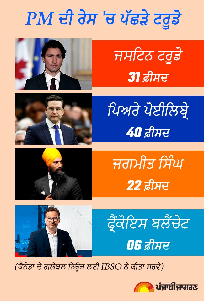 ਕੈਨੇਡਾ ਦੇ ਗਲੋਬਲ ਨਿਊਜ਼ ਲਈ ਆਈਬੀਐੱਸਓ (IBSO)ਵੱਲੋਂ ਕਰਵਾਏ ਗਏ ਸਰਵੇਖਣ ਤੋਂ ਪਤਾ ਲੱਗਾ ਹੈ ਕਿ ਵਿਰੋਧੀ ਧਿਰ ਕੰਜ਼ਰਵੇਟਿਵ ਪਾਰਟੀ ਦੇ ਨੇਤਾ ਪਿਅਰੇ ਪੋਇਲੀਵਰੇ ਪ੍ਰਧਾਨ ਮੰਤਰੀ ਹਨ। 40 ਫੀਸਦੀ ਕੈਨੇਡੀਅਨ ਨਾਗਰਿਕ ਪਿਅਰੇ ਨੂੰ ਪ੍ਰਧਾਨ ਮੰਤਰੀ ਵਜੋਂ ਪਸੰਦ ਕਰਦੇ ਹਨ ਜਦੋਂਕਿ ਮੌਜੂਦਾ ਜਸਟਿਨ ਟਰੂਡੋ ਉਨ੍ਹਾਂ ਤੋਂ ਪਿੱਛੇ ਹਨ।
