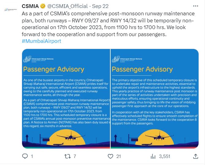 ਛਤਰਪਤੀ ਸ਼ਿਵਾਜੀ ਮਹਾਰਾਜ ਅੰਤਰਰਾਸ਼ਟਰੀ ਹਵਾਈ ਅੱਡਾ (CSMIA) ਨੇ ਕਿਹਾ ਕਿ ਹਵਾਈ ਅੱਡੇ ਦੇ ਦੋਵੇਂ ਰਨਵੇਅ, RWY 14/32 ਅਤੇ 09/27 ‘ਤੇ ਰੱਖ-ਰਖਾਅ ਦਾ ਕੰਮ ਕੀਤਾ ਜਾਵੇਗਾ, ਇਸ ਲਈ ਮੰਗਲਵਾਰ ਨੂੰ ਬੰਦ ਰੱਖਣ ਦਾ ਫ਼ੈਸਲਾ ਕੀਤਾ ਗਿਆ ਹੈ। CSMIA ਨੇ ਟਵੀਟ ਕੀਤਾ ਕਿ ਅਸੀਂ ਮੌਨਸੂਨ ਤੋਂ ਬਾਅਦ ਰਨਵੇਅ ਸਟ੍ਰਿਪ ਮੇਨਟੇਨੈਂਸ ਦੇ ਹਿੱਸੇ ਵਜੋਂ ਮੰਗਲਵਾਰ ਨੂੰ ਸਵੇਰੇ 11 ਵਜੇ ਤੋਂ ਸ਼ਾਮ 5 ਵਜੇ ਤੱਕ ਮੁੰਬਈ ਏਅਰਪੋਰਟ ਦੇ ਰਨਵੇ ਨੂੰ ਬੰਦ ਕਰਨ ਦੀ ਯੋਜਨਾ ਬਣਾਈ ਹੈ।