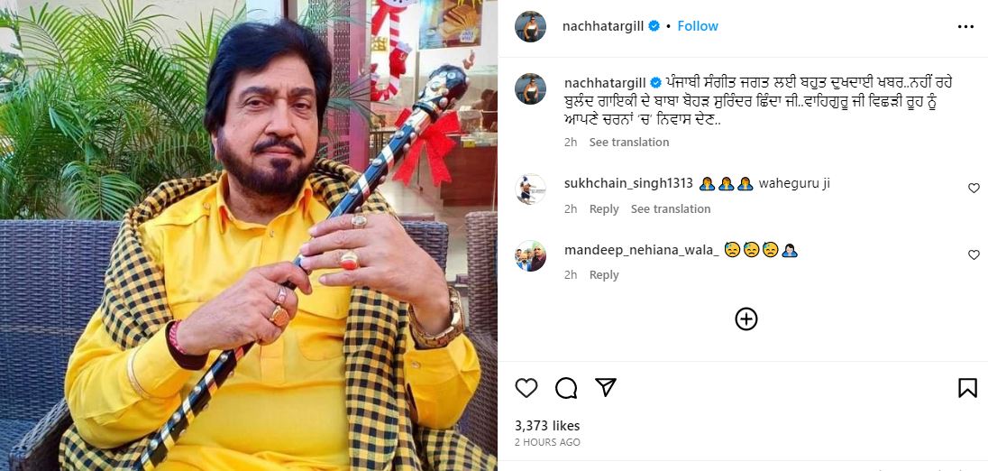 ਪੰਜਾਬੀ ਗਾਇਕ ਨਛੱਤਰ ਗਿੱਲ ਨੇ ਕਿਹਾ, ‘ਪੰਜਾਬੀ ਸੰਗੀਤ ਜਗਤ ਲਈ ਬਹੁਤ ਦੁਖਦਾਈ ਖ਼ਬਰ…ਨਹੀਂ ਰਹੇ ਬੁਲੰਦ ਗਾਇਕੀ ਦੇ ਬਾਬਾ ਬੋਹੜ ਸੁਰਿੰਦਰ ਛਿੰਦਾ ਜੀ…ਵਾਹਿਗੁਰੂ ਜੀ ਵਿਛਲੀ ਰੂਹ ਨੂੰ ਆਪਣੇ ਚਰਨਾਂ ‘ਚ ਨਿਵਾਸ ਦੇਣ…’