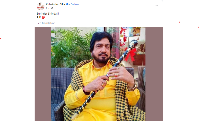 ਗਾਇਕ ਕੁਲਵਿੰਦਰ ਬਿੱਲਾ ਨੇ ਵੀ ਸੁਰਿੰਦਰ ਛਿੰਦਾ ਦੇ ਦੇਹਾਂਤ ‘ਚ ਡੂੰਘੇ ਦੁੱਖ ਦਾ ਪ੍ਰਗਟਾਵਾ ਕੀਤਾ। ਉਨ੍ਹਾਂ ਅਫਸੋਸ ਪ੍ਰਗਟਾਉਂਦਿਆਂ ਕਿਹਾ ਕਿ ਪਰਮਾਤਮਾਂ ਵਿੱਛੜੀ ਰੂਹ ਨੂੰ ਆਪਣੇ ਚਰਨਾਂ ‘ਚ ਨਿਵਾਸ ਦੇਵੇ…