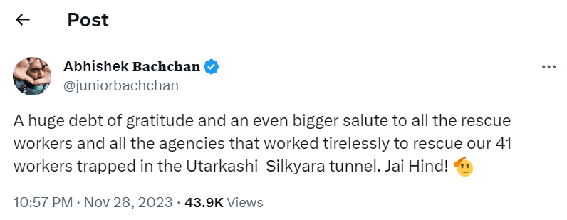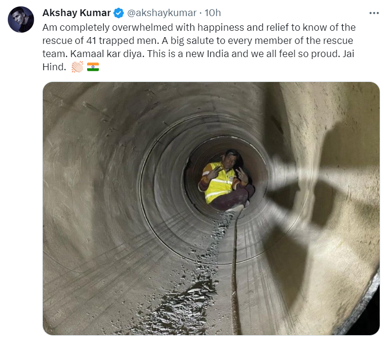 ਅਕਸ਼ੈ ਕੁਮਾਰ ਤੋਂ ਇਲਾਵਾ ਹੋਰ ਵੀ ਕਈ ਮਸ਼ਹੂਰ ਹਸਤੀਆਂ ਨੇ ਇਨ੍ਹਾਂ ਲੋਕਾਂ ਨੂੰ ਸਲਾਮ ਕੀਤਾ ਹੈ। ਅਭਿਸ਼ੇਕ ਬੱਚਨ ਨੇ ਵੀ ਫੋਟੋ ਸ਼ੇਅਰ ਕੀਤੀ ਅਤੇ ਲਿਖਿਆ, ਸਾਰੇ ਬਚਾਅ ਕਰਮਚਾਰੀਆਂ ਅਤੇ ਸਾਰੀਆਂ ਏਜੰਸੀਆਂ ਨੂੰ ਬਹੁਤ-ਬਹੁਤ ਧੰਨਵਾਦ ਅਤੇ ਇਸ ਤੋਂ ਵੀ ਵੱਡਾ ਸਲਾਮ ਜਿਨ੍ਹਾਂ ਨੇ ਉੱਤਰਕਾਸ਼ੀ ਸੁਰੰਗ ਵਿਚ ਫਸੇ ਸਾਡੇ 41 ਕਰਮਚਾਰੀਆਂ ਨੂੰ ਬਚਾਉਣ ਲਈ ਹਰ ਕੋਸ਼ਿਸ਼ ਕੀਤੀ। ਜੈ ਹਿੰਦ…