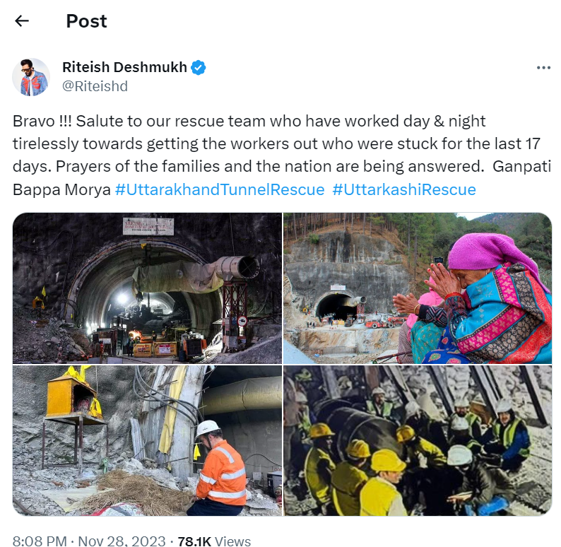 ਅਦਾਕਾਰ ਰਿਤੇਸ਼ ਦੇਸ਼ਮੁਖ ਨੇ ਇੰਸਟਾਗ੍ਰਾਮ ‘ਤੇ ਸੁਰੰਗ ਦੀਆਂ ਕਈ ਤਸਵੀਰਾਂ ਸ਼ੇਅਰ ਕਰ ਕੇ ਆਪਣੀ ਖੁਸ਼ੀ ਜ਼ਾਹਰ ਕੀਤੀ ਅਤੇ ਲਿਖਿਆ, ਵਾਹ-ਵਾਹ! ਸਾਡੀ ਬਚਾਅ ਟੀਮ ਨੂੰ ਸਲਾਮ ਜਿਨ੍ਹਾਂ ਨੇ ਪਿਛਲੇ 17 ਦਿਨਾਂ ਤੋਂ ਫਸੇ ਮਜ਼ਦੂਰਾਂ ਨੂੰ ਬਚਾਉਣ ਲਈ ਦਿਨ-ਰਾਤ ਅਣਥੱਕ ਮਿਹਨਤ ਕੀਤੀ ਹੈ। ਪਰਿਵਾਰਾਂ ਤੇ ਕੌਮ ਦੀਆਂ ਅਰਦਾਸਾਂ ਦਾ ਜਵਾਬ ਦਿੱਤਾ ਜਾ ਰਿਹਾ ਹੈ। ਗਣਪਤੀ ਬੱਪਾ ਮੋਰਿਆ।