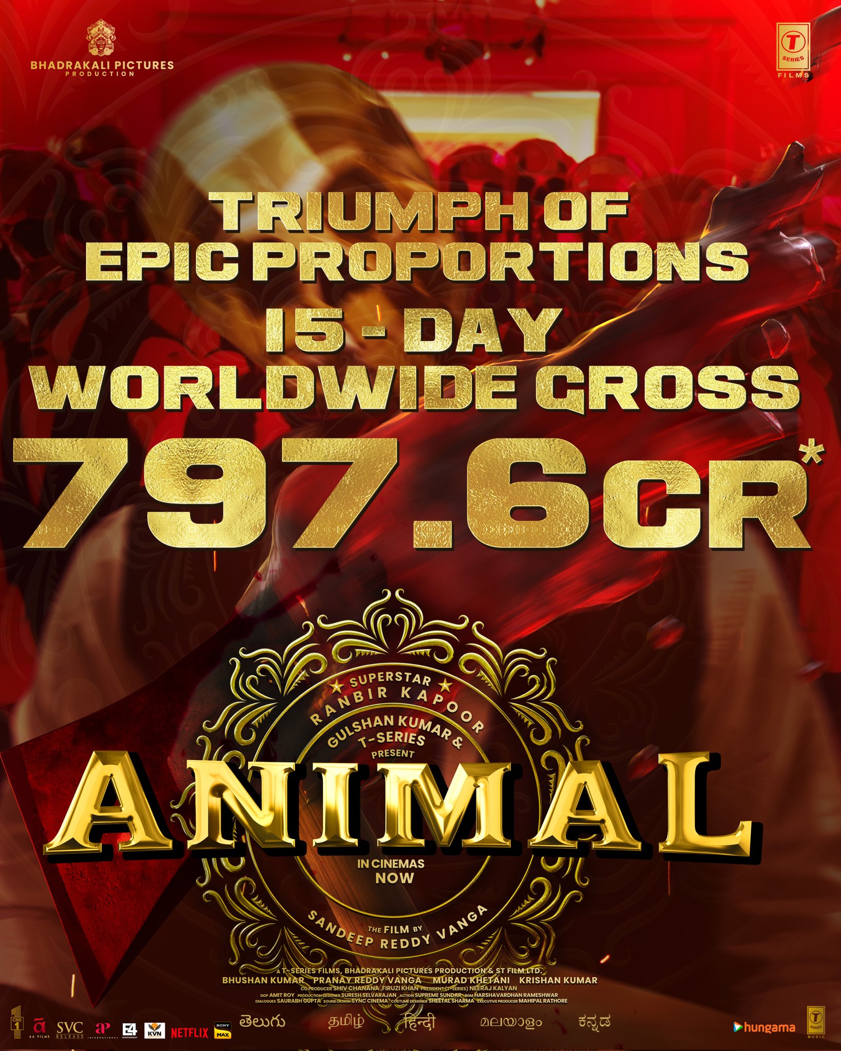 ਨਿਰਮਾਤਾਵਾਂ ਦੁਆਰਾ ਸਾਂਝੇ ਕੀਤੇ ਗਏ ਤਾਜ਼ਾ ਅੰਕੜਿਆਂ ਦੇ ਅਧਾਰ ‘ਤੇ ਇਸ ਫਿਲਮ ਨੇ ਆਪਣੀ ਰਿਲੀਜ਼ ਦੇ 15 ਦਿਨਾਂ ਦੇ ਅੰਦਰ ਪੂਰੀ ਦੁਨੀਆ ਵਿੱਚ 797.6 ਕਰੋੜ ਰੁਪਏ ਦਾ ਵੱਡਾ ਕਾਰੋਬਾਰ ਕੀਤਾ ਹੈ। ਅਜਿਹੇ ‘ਚ ਹੁਣ ਨਿਰਦੇਸ਼ਕ ਸੰਦੀਪ ਰੈੱਡੀ ਵਾਂਗਾ ਦੀ ਇਹ ਫਿਲਮ 800 ਕਰੋੜ ਦੇ ਕਲੱਬ ‘ਚ ਸ਼ਾਮਲ ਹੋਣ ਤੋਂ ਮਹਿਜ਼ 3 ਕਰੋੜ ਰੁਪਏ ਘੱਟ ਹੈ।