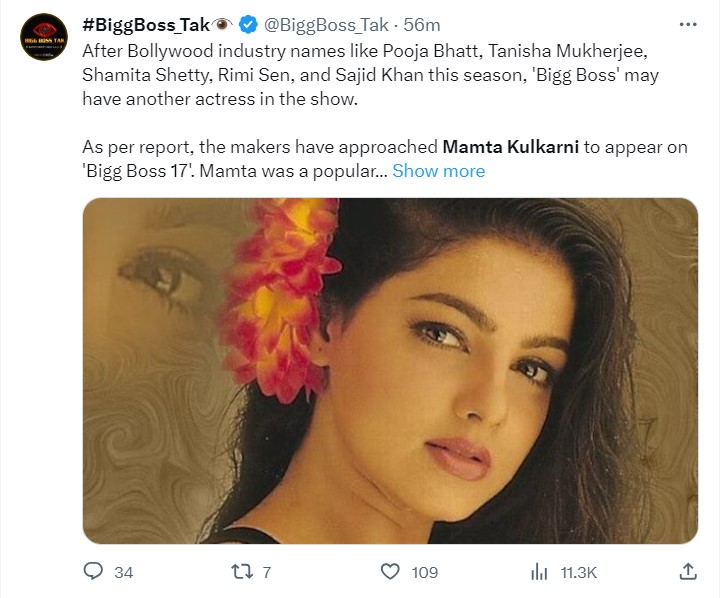 ਮਮਤਾ ਕੁਲਕਰਨੀ ਨੇ ਸਲਮਾਨ ਖਾਨ ਨਾਲ ਫਿਲਮ ‘ਕਰਨ-ਅਰਜੁਨ’ ‘ਚ ਕੰਮ ਕੀਤਾ ਸੀ, ਜੋ ਬਲਾਕਬਸਟਰ ਰਹੀ ਸੀ। ਹੁਣ ਜੇਕਰ ਅਦਾਕਾਰਾ ਬਿੱਗ ਬੌਸ 17 ‘ਚ ਹਿੱਸਾ ਲੈਂਦੀ ਹੈ ਤਾਂ ਇਹ ਦੋਹਾਂ ਦਾ ਰੀਯੂਨੀਅਨ ਵੀ ਹੋਵੇਗਾ।