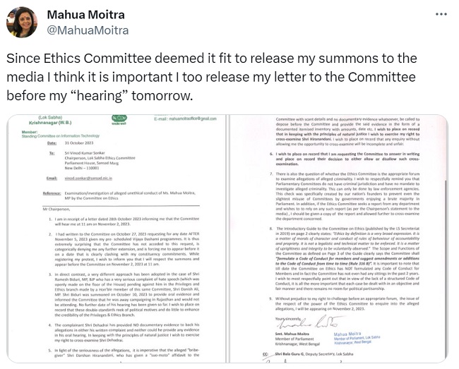 TMC ਸੰਸਦ ਮਹੂਆ ਮੋਈਤਰਾ ਨੇ ਸੋਸ਼ਲ ਮੀਡੀਆ ਪਲੇਟਫਾਰਮ X ‘ਤੇ ਇਹ ਜਾਣਕਾਰੀ ਦਿੱਤੀ ਹੈ। ਉਨ੍ਹਾਂ ਨੇ ਦੋ ਪੰਨਿਆਂ ਦਾ ਪੱਤਰ ਵੀ ਜਾਰੀ ਕੀਤਾ ਹੈ। ਉਨ੍ਹਾਂ ਲਿਖਿਆ- ‘ਨੈਤਿਕਤਾ ਕਮੇਟੀ ਨੇ ਮੀਡੀਆ ਨੂੰ ਮੇਰੇ ਸੰਮਨ ਜਾਰੀ ਕਰਨਾ ਉਚਿਤ ਸਮਝਿਆ। ਇਸ ਲਈ ਮੈਂ ਸਮਝਦਾ ਹਾਂ ਕਿ ਇਹ ਜ਼ਰੂਰੀ ਹੈ ਕਿ ਮੈਂ ਕੱਲ੍ਹ ਦੀ ਸੁਣਵਾਈ ਤੋਂ ਪਹਿਲਾਂ ਕਮੇਟੀ ਨੂੰ ਆਪਣਾ ਪੱਤਰ ਵੀ ਜਾਰੀ ਕਰ ਦਵਾਂ। .jpg)