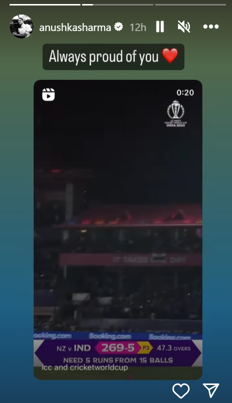 ਭਾਰਤ ਤੇ ਨਿਊਜ਼ੀਲੈਂਡ ਵਿਚਾਲੇ ਖੇਡੇ ਗਏ ਮੈਚ ‘ਚ ਵਿਰਾਟ ਕੋਹਲੀ ਨੇ ਸ਼ਾਨਦਾਰ ਪ੍ਰਦਰਸ਼ਨ ਕੀਤਾ ਪਰ ਉਹ ਸੈਂਕੜਾ ਬਣਾਉਣ ਤੋਂ ਖੁੰਝ ਗਏ। ਵਿਰਾਟ ਦੀ ਇਸ ਧਮਾਕੇਦਾਰ ਪਾਰੀ ਤੋਂ ਬਾਅਦ ਹੁਣ ਉਨ੍ਹਾਂ ਦੀ ਪਤਨੀ ਅਤੇ ਬਾਲੀਵੁੱਡ ਅਦਾਕਾਰਾ ਅਨੁਸ਼ਕਾ ਸ਼ਰਮਾ ਨੇ ਵੀ ਆਪਣੀ ਪ੍ਰਤੀਕਿਰਿਆ ਦਿੱਤੀ ਹੈ। ਅਨੁਸ਼ਕਾ ਨੇ ਆਪਣੇ ਸੋਸ਼ਲ ਮੀਡੀਆ ਹੈਂਡਲ ਇੰਸਟਾਗ੍ਰਾਮ ਸਟੋਰੀ ‘ਤੇ ਵਿਰਾਟ ਕੋਹਲੀ ਦੀ ਬੱਲੇਬਾਜ਼ੀ ਦੀਆਂ ਵੀਡੀਓ ਅਤੇ ਤਸਵੀਰਾਂ ਸ਼ੇਅਰ ਕੀਤੀਆਂ ਹਨ। ਇਸ ਦੇ ਨਾਲ ਹੀ ਉਨ੍ਹਾਂ ਨੇ ਇਕ ਸਟੋਰੀ ‘ਤੇ ਲਿਖਿਆ, ‘ਹਮੇਸ਼ਾ ਤੁਹਾਡੇ ‘ਤੇ ਮਾਣ ਹੈ’।