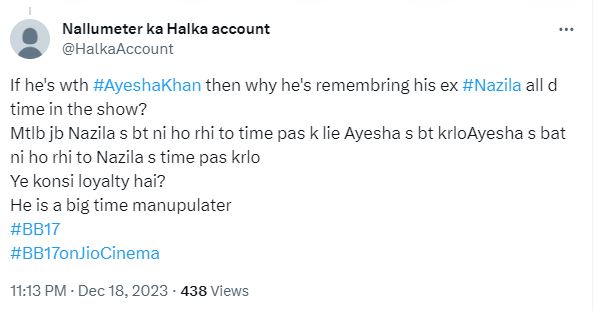 ਇਕ ਹੋਰ ਯੂਜ਼ਰ ਨੇ ਲਿਖਿਆ, ‘ਜੇ ਉਹ ਆਇਸ਼ਾ ਨੂੰ ਡੇਟ ਕਰ ਰਿਹਾ ਹੈ ਤਾਂ ਉਹ ਆਪਣੀ ਸਾਬਕਾ ਪ੍ਰੇਮਿਕਾ ਨਾਜ਼ੀਲਾ ਨੂੰ ਹਰ ਸਮੇਂ ਕਿਉਂ ਯਾਦ ਕਰਦਾ ਹੈ? ਮਤਲਬ ਜਦੋਂ ਨਾਜ਼ੀਲਾ ਨਾਲ ਗੱਲ ਨਾ ਹੋਵੇ ਤਾਂ ਉਹ ਆਇਸ਼ਾ ਨਾਲ ਗੱਲ ਕਰਦਾ ਹੈ ਅਤੇ ਜਦੋਂ ਆਇਸ਼ਾ ਨਾਲ ਗੱਲ ਨਾ ਹੋ ਰਹੀ ਹੋਵੇ ਤਾਂ ਉਹ ਨਾਜ਼ੀਲਾ ਨਾਲ ਗੱਲ ਕਰਦਾ ਹੈ। ਕਿੰਨਾ ਵੱਡਾ ਮੈਨਿਊਪੁਲੇਟਰ ਹੈ ਇਹ।’