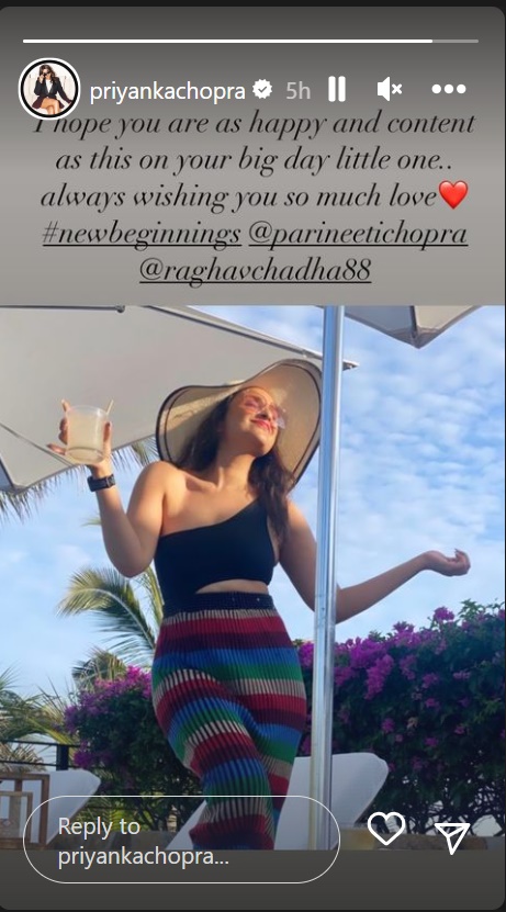 ਉਦੈਪੁਰ ਦੇ ਲੀਲਾ ਪੈਲੇਸ ’ਚ ਪਰਿਣੀਤੀ ਤੇ ਰਾਘਵ ਸੱਤ ਫੇਰੇ ਲੈਣਗੇ। ਦੋਵਾਂ ਦੇ ਵਿਆਹ ’ਚ ਸ਼ਾਮਿਲ ਹੋਣ ਲਈ ਬਾਲੀਵੁੱਡ ਸੈਲੇਬਸ ਰਵਾਨਾ ਵੀ ਹੋ ਚੁੱਕੇ ਹਨ। ਚੱਢਾ ਤੇ ਚੋਪੜਾ ਵੀ ਬੀਤੇ ਦਿਨ ਮੁੰਬਈ ਏਅਰਪੋਰਟ ’ਤੇ ਦੇਕੇ ਗਏ ਸਨ। ਜੋੜੀ ਦੇ ਵਿਆਹ ਦੀਆਂ ਵੀਡੀਓਜ਼ ਵੀ ਸੋਸ਼ਲ ਮੀਡੀਆ ’ਤੇ ਕਾਫ਼ੀ ਵਾਇਰਲ ਹੋ ਰਹੀਆਂ ਹਨ। ਅਜਿਹੇ ’ਚ ਪ੍ਰਿਅੰਕਾ ਦਾ ਵਿਆਹ ’ਚ ਸ਼ਾਮਲ ਨਾ ਹੋਣਾ ਕਾਫ਼ੀ ਚਰਚਾ ’ਚ ਹੈ। ਹਾਲ ਹੀ ’ਚ ਪ੍ਰਿਅੰਕਾ ਚੋਪੜਾ ਨੇ ਪਰਿਣੀਤੀ ਦੇ ਇਸ ਖ਼ਾਸ ਦਿਨ ’ਤੇ ਸ਼ਾਮਿਲ ਨਾ ਹੋਣ ’ਤੇ ਇਕ ਖ਼ਾਸ ਪੋਸਟ ਸ਼ੇਅਰ ਕੀਤੀ ਹੈ। ਜਿਸ ਨਾਲ ਇਹ ਪੱਕਾ ਹੋ ਗਿਆ ਹੈ ਕਿ ਉਹ ਵਿਆਹ ’ਚ ਨਹੀਂ ਆ ਸਕੇਗੀ।
