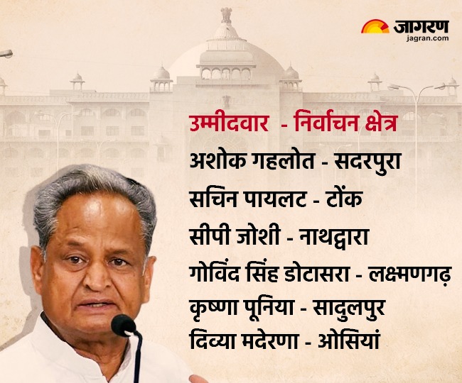 ਕਾਂਗਰਸ ਵੱਲੋਂ ਜਾਰੀ ਸੂਚੀ ਅਨੁਸਾਰ ਸੀਐੱਮ ਅਸ਼ੋਕ ਗਹਲੋਤ ਨੂੰ ਸਦਰਪੁਰਾ ਤੋਂ, ਸਚਿਨ ਪਾਇਲਟ ਨੂੰ ਟੋਂਕ ਤੋਂ, ਸੀਪੀ ਜੋਸ਼ੀ ਨੂੰ ਨਾਥਦੁਆਰਾ ਤੋਂ, ਦਿਵਿਆ ਮਦੇਰਨਾ ਨੂੰ ਓਸੀਆਂ ਤੋਂ, ਗੋਵਿੰਦ ਸਿੰਘ ਡੋਟਾਸਰਾ ਨੂੰ ਲਕਸ਼ਮਣਗੜ੍ਹ ਤੋਂ ਤੇ ਕ੍ਰਿਸ਼ਨਾ ਪੂਨੀਆ ਨੂੰ ਸਾਦੁਲਪੁਰ ਤੋਂ ਉਮੀਦਵਾਰ ਬਣਾਇਆ ਗਿਆ ਹੈ।