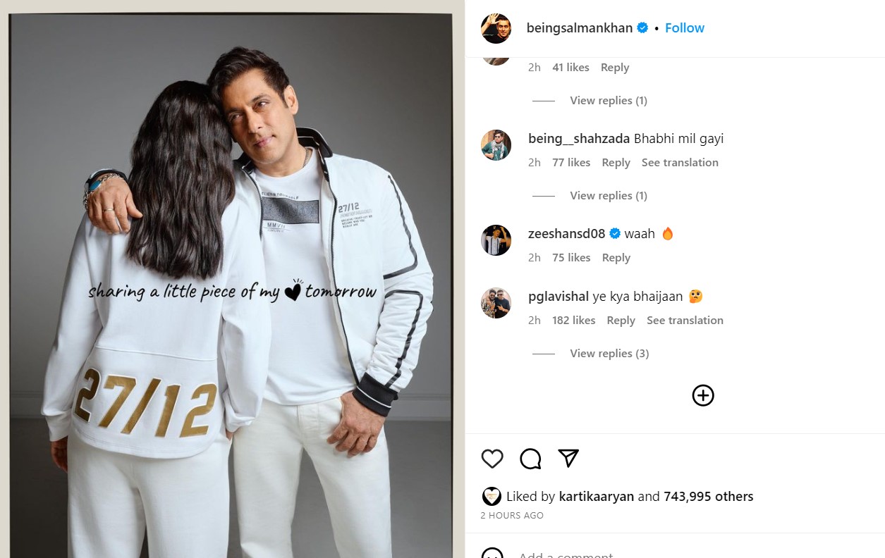 ਇਕ ਹੋਰ ਯੂਜ਼ਰ ਨੇ ਟਿੱਪਣੀ ਕੀਤੀ, ‘ਭੈਣ ਦਾ ਚਿਹਰਾ ਜਲਦੀ ਹੀ ਦਿਖਾਇਆ ਜਾਵੇਗਾ।’ ਜ਼ਿਆਦਾਤਰ ਲੋਕਾਂ ਨੇ ਕੁਮੈਂਟ ਕੀਤੀ ਕਿ ਸਲਮਾਨ ਨੇ ਆਪਣੇ ਲਈ ਲੜਕੀ ਨੂੰ ਚੁਣ ਲਿਆ ਹੈ।