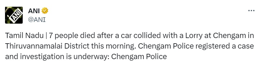 ਏਐੱਨਆਈ, ਚੇਂਗਮ : ਤਮਿਲਨਾਡੂ ਦੇ ਤਿਰੁਵੰਨਮਲਾਈ ਜ਼ਿਲ੍ਹੇ ਦੇ ਚੇਂਗਮ ਦੇ ਕੋਲ ਐਤਵਾਰ ਨੂੰ ਇਕ ਦਰਦਨਾਕ ਸੜਕ ਹਾਦਸਾ ਹੋਇਆ। ਇਸ ਹਾਦਸੇ ’ਚ ਸੱਤ ਲੋਕਾਂ ਦੀ ਮੌਤ ਹੋ ਗਈ। ਇਹ ਘਟਨਾ ਉਦੋਂ ਘਟੀ ਜਦੋਂ ਕਾਰ ਤੇ ਲਾਰੀ ਦੀ ਆਹਮੋ-ਸਾਹਮਣੇ ਟੱਕਰ ਹੋ ਗਈ।