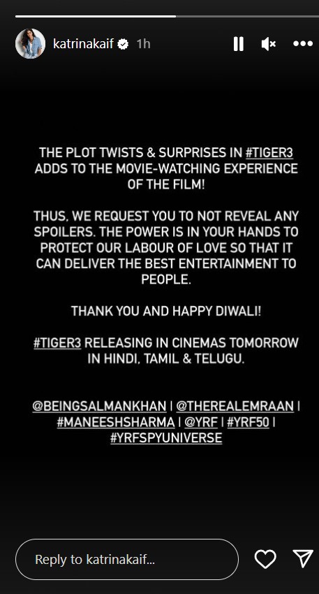 ਉਨ੍ਹਾਂ ਨੇ ਸੋਸ਼ਲ ਮੀਡੀਆ ‘ਤੇ ਪੋਸਟ ਕੀਤਾ, ‘ਟਾਈਗਰ 3 ਵਿਚ ਜ਼ਬਰਦਸਤ twists turns ਫਿਲਮ ਦੇਖਣ ਦੇ ਅਨੁਭਵ ਨੂੰ ਹੋਰ ਰੋਮਾਂਚਕ ਬਣਾਉਂਦੇ ਹਨ। ਅਸੀਂ ਤੁਹਾਨੂੰ ਬੇਨਤੀ ਕਰਦੇ ਹਾਂ ਕਿ ਕੋਈ ਵੀ ਸਪਾਈਲਰ ਨਾ ਦਿਓ। ਸਾਡੀ ਮਿਹਨਤ ਦੀ ਰੱਖਿਆ ਕਰਨਾ ਤੁਹਾਡੇ ਹੱਥ ਵਿੱਚ ਹੈ ਤਾਂ ਜੋ ਅਸੀਂ ਲੋਕਾਂ ਦਾ ਮਨੋਰੰਜਨ ਕਰ ਸਕੀਏ। ਧੰਨਵਾਦ ਅਤੇ ਦੀਵਾਲੀ ਦੀਆਂ ਮੁਬਾਰਕਾਂ।